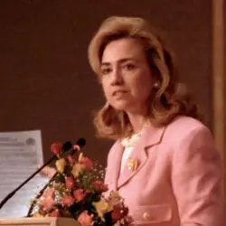 This item is a photograph of First Lady Hillary Clinton at the United Nations Conference on Women in Beijing, China. The image was photographed by Sharon Farmer.