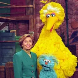 This item is a photograph of First Lady Hillary Rodham Clinton posing on the Big Bird nest set with Big Bird and Rosita to celebrate the 25th season of Sesame Street in New York City. The image was photographed by Barbara Kinney.