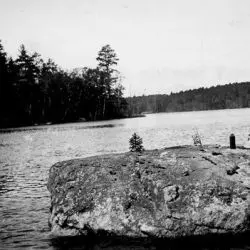 Original caption: International boundary marker, Canada-United States; taken on Iron Lake. (Note small spruce growing in crevice of boulder.).