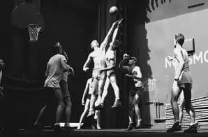 Activities aboard USS Monterey (CVL-26). Navy pilots in the forward elevator well playing basketball. Photographer: Victor Jorgensen.
