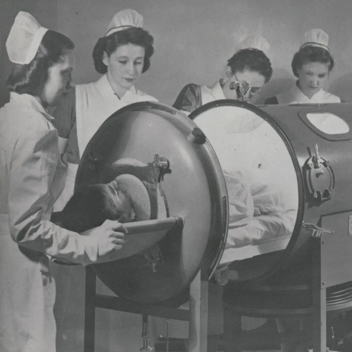 The photograph shows nurses being trained on the use of a respirator, or an “iron lung,” for a polio patient.
