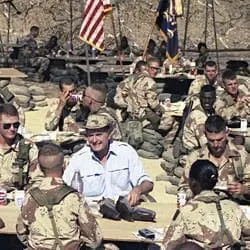 President George H. W. Bush shared 1990 Thanksgiving dinner while visiting U.S. troops in Saudi Arabia during the first Persian Gulf War.