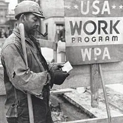 In this January 1939 photograph, a Work Projects Administration (WPA) employee receives his paycheck at a construction site. The WPA was a New Deal program created during the Great Depression to employ Americans and complete a variety of public projects, such as buildings, roads, and bridges.