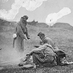 The three Confederate soldiers huddled around a fire in this photograph were stationed on picket duty. Units on both sides stationed a picket guard, consisting of a lieutenant, 2 sergeants, 4 corporals, and 40 privates in advance of each regiment. The picket provided security and advance warning of enemy movement, especially an attack.