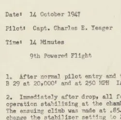 This document is a first-hand account of United States Air Force Captain Charles “Chuck” Yeager’s accomplishment of breaking the sound barrier in a piloted aircraft on October 14, 1947.