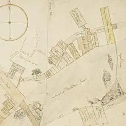 This map comes from a civil suit brought by Stephen Jenkes against David and Daniel Wilkinson, neighboring mill owners, for infringement of Jenkes’ water rights along the Blackstone River in Pawtucket, Rhode Island. Jenkes claimed that the Wilkinsons wrongfully interfered with the water flow of their mutual flume by destroying the flume’s banks, blocking Jenkes’ water trench with timber and other trash, and erecting buildings over the water, thereby limiting Jenkes’ access to water power, and adversely affecting the production capabilities of his mill and blacksmith shop. The Wilkinsons were found guilty, and damages were assessed at one cent.