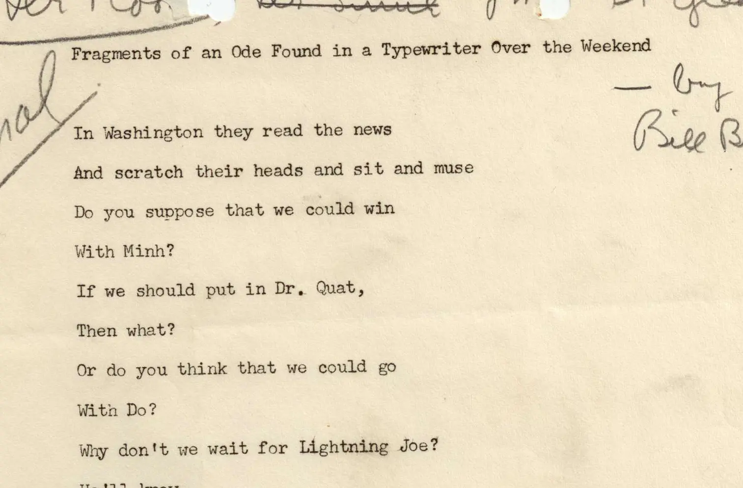 Full Citation: Poem: Fragments of an Ode Found in a Typewriter Over the Weekend; 1955; Tilghman B. Koons Day File, 1953-1957 (3); Personal Papers, 1895 – 1974; Collection DDE-1060: Robert Cutler Papers,; Dwight D. Eisenhower Library, Abilene, KS. [Online Version, https://docsteach.org/document/poem-fragments-ode-found-typewriter/, April 8, 2026]