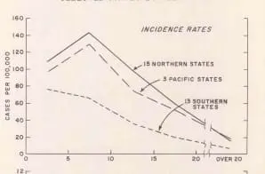 This chart provides data concerning the distribution of polio cases by age and region from 1952.