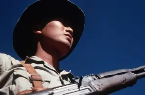 This photograph shows a Viet Cong soldier standing beneath a Viet Cong flag carrying his AK-47 rifle. He was participating in the exchange of POWs by the Four Power Joint Military Commission at Loc Ninh in South Vietnam.
