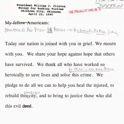 This is President Bill Clinton’s speech card notes for the eulogy he delivered at the memorial for the April 1995 victims of the bombing at the Alfred P. Murrah Federal Building in Oklahoma City.