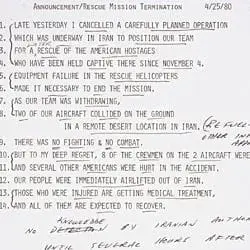 This is an annotated speech card from President Jimmy Carter’s April 1980 speech announcing that the rescue mission attempting to free American hostages in Iran had failed.