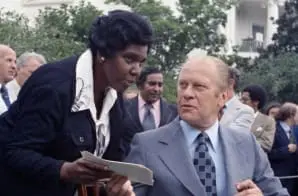 This photograph shows Representative Barbara Jordan of Texas with President Gerald Ford as he signs an extension for the Voting Rights Act of 1965.