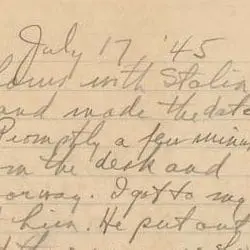 Full Citation: President Harry S. Truman’s Diary Entry for July 17, 1945; 7/17/1945; Subject Files, 1939–1952; Collection HST-AF: Alonzo Fields Papers,; Harry S. Truman Library, Independence, MO. [Online Version, https://docsteach.org/document/president-harry-s-trumans-diary-entry-for-july-17-1945/, April 23, 2026]