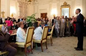 President Barack Obama speaks with Legal Defense Fund board members, leadership and guests commemorating the 60th anniversary of the Brown v. Board of Education Supreme Court decision, in the State Dining Room of the White House, May 16, 2014.