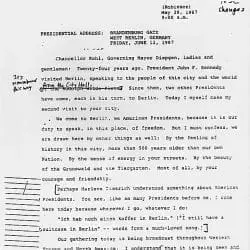 Another draft of Ronald Reagan’s Brandenburg Gate speech (“Mr. Gorbachev, tear down this wall”), with comments and edits supplied by the National Security Council.