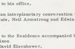 President Richard Nixon’s daily diary shows a busy evening on July 20, 1969. Nixon’s last phone call took place at 11:45 P.M. It was an “interplanetary conversation” with astronauts Neil Armstrong and “Buzz” Aldrin, from the moon. During the conversation Armstrong said: “It’s a great honor and privilege for us to be here representing not only the United States but men of peace of all nations.”