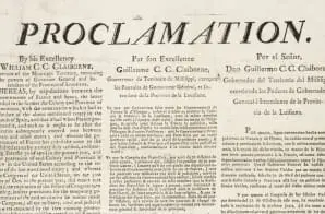 Through the Louisiana Purchase of 1803, France sold more than 800,000 square miles of land to the United States for $15 million—doubling the size of the fledgling country and paving the way for westward expansion. This proclamation assured inhabitants of their rights. Because the territory had been recently transferred from Spain to France, it was printed in English, French, and Spanish.