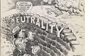 This cartoon shows three prominent isolationist senators staring blindly at a wall labeled “neutrality,” while embattled Europe is shown in the distance, engulfed in a cloud of smoke. The figures in the cartoon are William Borah of Idaho, Gerald Nye of North Dakota, and Hiram Johnson of California.
