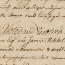 These are the details from a town meeting in Providence, Rhode Island, regarding the issue of troops being barracked upon the population, recorded by town clerk Theodore Foster. It records that the freemen of Providence voted and resolved in their town meeting to appoint a committee to address to their delegates in Congress that accommodation for the troops should be provided at the expense of the United States.