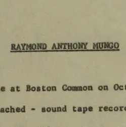 This item is a copy of the speech given by college student Raymond Anthony Mungo at the Boston Commons for an anti-Vietnam draft rally. This document was digitized by teachers in our Primarily Teaching 2013 Summer Workshop at our Boston location.