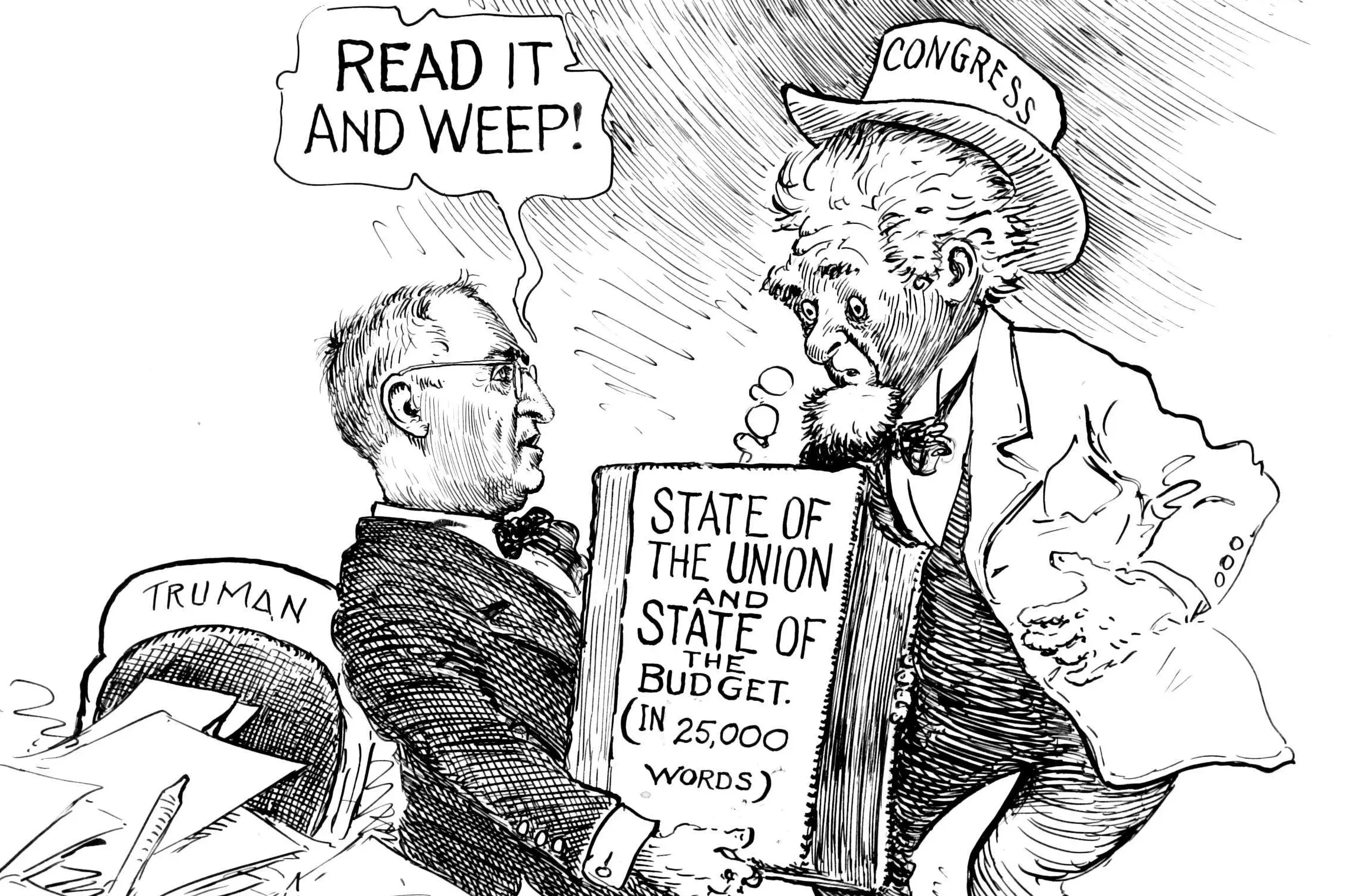 From the adoption of the Constitution, Congress has evolved different ways to implement annual Federal budgets. In 1921, Congress passed the Budget and Accounting Act, which centralized budgeting and made the President responsible for submitting an annual budget to Congress. This 1946 cartoon depicts Congress’s shocked reaction to the level of Federal spending that President Harry S. Truman proposed in the first post–World War II budget. Uneasy with the growth of Presidential power during the Great Depression and World War II, later that year Congress passed legislation that sought to regain its budgetary powers. This report was the first of its kind since 1930 during the presidency of Herbert Hoover. Truman combined the State of the Union and State of the Budget reports to form a larger article that spanned twenty-five thousand words.