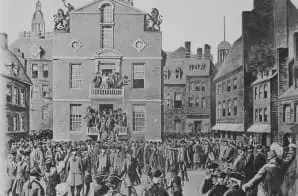 This is a copy of artwork showing the reading of the Declaration of Independence from the East balcony of the Old State House in Boston, Massachusetts. It was gathered as part of the George Washington Bicentennial Commission in 1931-1932. The Commission’s purpose was to celebrate the birth and accomplishments of Washington, and to collect, preserve, and publish writings, artworks, and photographs pertinent to his life and times.
