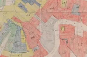 This is a redlining map for New Orleans, Louisiana. These maps were created and annotated to show mortgage lending risk by neighborhood type, including residential, commercial and industrial areas. Residential districts are marked by different colors related to the level of risk in lending in those neighborhoods. These types of maps were later known as redlining maps related to the color given to the neighborhoods that were measured as most risky for loans.