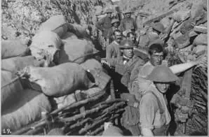 The original caption for this photograph reads; Repairing front line trench after bomb explosion fifty yards from enemy trenches. D. W. Griffith in civilian clothing. During filming of the motion picture “Hearts of the World” in France, 1917.