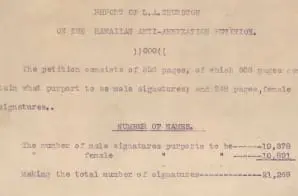 Lorrin A. Thurston, grandson of American missionaries, was a prominent lawyer, politician and businessman who played a major role in the overthrow of Queen Liliʻuokalani. An advocate for annexation, he submitted this report detailing anomalies and other issues with the signatures on the anti-annexation petition. Among the issues he raised was that a significant percentage of the petitioners were minors (some as young as 2 years old) and that certain details (such as the age of petitioner) were altered.