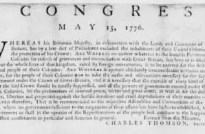 In this Resolution of the Continental Congress, the delegates state that since the British Crown and Parliament had excluded the colonies from its protection, had not sent an answer to their petitions, and that the force of the kingdom (including foreign mercenaries) were being “exerted for the destruction of the good people of these colonies,” that all authority from the British Crown should be totally suppressed. Instead, that the United Colonies must adopt their own government for the “happiness and safety” of Americans..