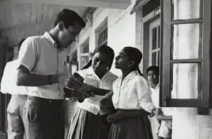 Pictured in this 1965 photograph are Roger Rhatton, 24, a Peace Corps volunteer from Bay Village, Ohio, and students in Tanganyika (now part of the nation of Tanzania), Africa. Established in 1961, the Peace Corps produced and collected photographs that illustrated its history and mission of overseeing Federal international volunteer and related domestic volunteer programs.