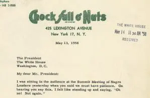 In this letter to President Eisenhower, Robinson, then vice president of personnel at Chock Full O’Nuts, criticized comments Eisenhower made urging Black people to have patience in their struggle for equality. Robinson urged Eisenhower to make a statement backed up with action to show his support for Black Americans.