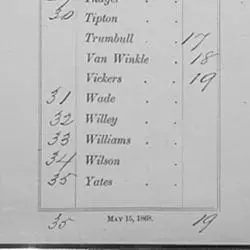 Full Citation: Roll call votes relating to the impeachment of President Andrew Johnson on Articles II, III, and XI; 5/26/1868; Records of the U.S. Senate, Record Group 46. [Online Version, https://docsteach.org/document/roll-call-votes-relating-to-the-impeachment-of-president-andrew-johnson-on-articles-ii-iii-and-xi/, February 8, 2026]