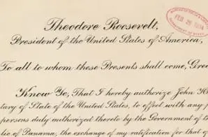 Know Ye, That I hereby authorize John Hay, Secretary of State of the United States, to effect with any person or persons duly authorized thereto by the Government of the Republic of Panama, the exchange of my ratification for that of the Government aforesaid, of the treaty between the United States and Panama providing for the construction of a ship canal to connect the waters of the Atlantic and Pacific Oceans, concluded at Washington, November 18, 1903.