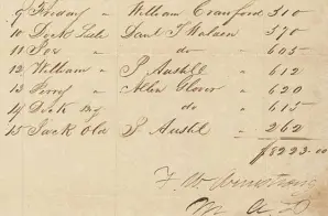 This document lists 15 enslaved people and their sale price. It comes from the case U.S. vs Schooners Constitution, Merino, Louisa, and 84 Slaves regarding the illegal importation of slaves. The Act Prohibiting Importation of Slaves had been enacted in 1807.