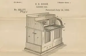 This file contains specifications, drawings, amendments, and correspondence for cabinet-beds, which would be folded up to resemble a desk when not in use. The patent was issued to Sarah E. Goode of Chicago, Illinois on July 14, 1885.