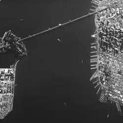 This satellite photograph, taken on October 29, 1985, shows the waterfront of San Francisco, California. A portion of the San Francisco-Oakland Bay Bridge is shown on the left, up to its approximate midpoint at Yerba Buena Island.
