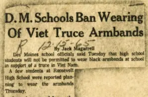 This article from The Des Moines Register was entered as defendants’ Exhibit 2 in John F. Tinker et. al. v. The Des Moines Independent Community School District et. al. It describes the decision of Des Moines, Iowa, school officials to ban students from wearing black armbands to school in support of a Vietnam War truce.