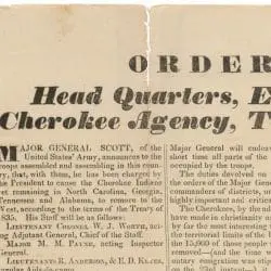 Considering the number and temper of the mass to be removed, together with the extent and fastnesses of the country occupied, it will readily occur, that simple indiscretions–acts of harshness and cruelty, on the part of our troops, may lead, step by step, to delays, to impatience and exasperation, and in the end, to a general war and carnage–a result, in the case of those particular Indians, utterly abhorrent to the generous sympathies of the whole American people. Every possible kindness, compatible with the necessity of removal, must, therefore, be shown by the troops, and, if, in the ranks, a despicable individual should be found, capable of inflicting wanton injury or insult on any Cherokee man, woman or child, it is hereby made the special duty of the nearest good officer or man, instantly to interpose, and to seize and consign the guilty wretch to the severest penalty of the laws. The Major General is fully persuaded that this injunction will not be neglected by the brave men under his command, who cannot be otherwise than jealous of their own honor and that of their country.