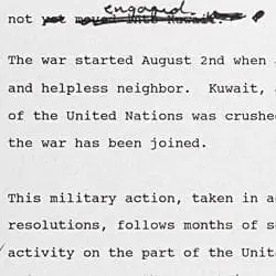 On January 16, 1991, President George Bush used national television to announce the commencement of the air campaign to free Kuwait. In this draft of the speech, with changes in the President’s own hand, he lays out the case for war.