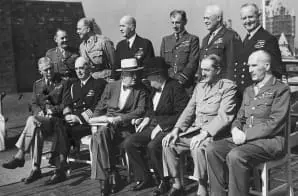 This photograph shows British and American combined Chiefs of Staff with President Franklin D. Roosevelt and Prime Minister Churchill at the Second Quebec Conference in 1944. Sitting are: G.C. Marshall, Admiral W.D. Leahy, President Roosevelt, Prime Minister Churchill, Field Marshal Sir Alan Brooks, and Field Marshal Sir John Dill. Standing are: Maj. Gen. Hollis, Gen. Sir Hasting Ismay, Admiral E.J. King, Air Marshal Sir Charles Portal, H.H. Arnold, and Admiral Sir A.B. Cunningham.