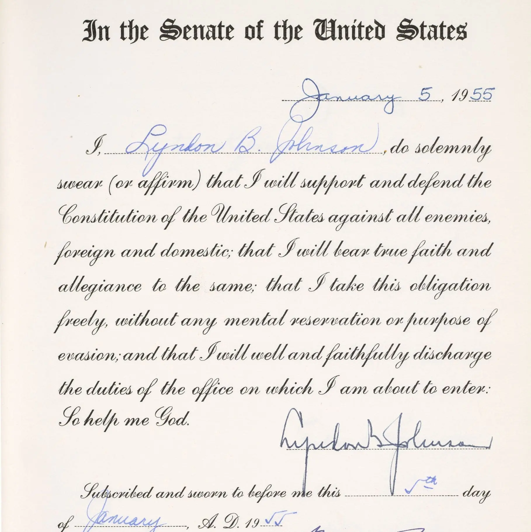 This is the oath of office signed by Lyndon Johnson in 1955 when he was elected to the Senate. From his service in the Senate, he became Vice President and then President in 1963. Government officials are required to take an oath of office. Since the first law passed by Congress in 1789, all Members of Congress, all Federal officials, and all state executives, legislatures, and judiciaries have taken an oath to support the Constitution.