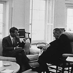 The photograph shows Senator Robert F. Kennedy (on the left) meeting with President Lyndon B. Johnson in the Oval Office at the White House.