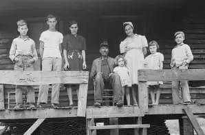 Original Caption: “The Sergent Family on their front porch. Reading from L. to R., Franklin D., Louis, Lucy, Mr. Blaine Sergent, Bobbie Jean, Mrs. Sergent, Wanda Lee and Donald. Mr. and Mrs. Sergent have two married sons living nearby, Rufus, who lives next door and is a coal cutter in the same mine and Junior who lives and works at Verda Mine several miles away. P V & K Coal Company, Clover Gap Mine, Lejunior, Harlan County, Kentucky.”