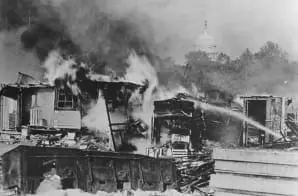 This photograph shows dwellings built by the Bonus Army being burned down. The Capitol Building is in the background. The original caption reads: “Shacks, put up by the Bonus Army on the Anacostia flats, Washington, DC, burning after the battle with the military.”