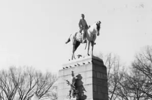 The 14-foot bronze equestrian statue of the famous Civil War commander faces north atop a tall granite pedestal. At the corners there are bronze soldiers representing four branches of the Army; infantry on the northwest; artillery on the northeast; cavalry on the southeast; and engineers on the southwest. On the east side below the statue is a bronze group of a woman and three children representing Peace. On the west side of the pedestal is a bronze group representing War with a woman with bound handsstanding on a dead soldier who clasps a rifle, two vultures prey on his body.