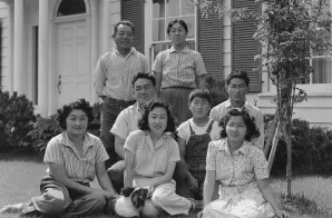 The original caption for this photograph reads: Mountain View, California. Members of the Shibuya family are pictured at their home before evacuation. The father and the mother were born in Japan and came to this country in 1904. At that time the father had $60 in cash and a basket of clothes. He later built a prosperous business of raising select varieties of chrysanthemums which he shipped to eastern markets under his own trade name. Six children in the family were born in the United States. The four older children attended leading California Universities. Evacuees of Japanese ancestry will be housed in War Relocation Authority Centers for the duration.