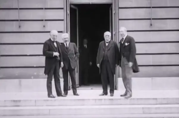 This silent film shows views of the Palace of Versailles and of the gardens, then the arrival of: French Foreign Minister Pichon, Premier Clemenceau, Robert Lansing, Gen. Bliss, Herbert Hoover, French Gen. Mounory, Gens. Allen and Pershing, Col. House, Arthur Balfour, Ignace Paderewski, Lloyd George, Baron Sonnino, Amb. Hugh Wallace, and President and Mrs. Wilson. Clemenceau addresses the gathering. The U.S. and British delegates sign the treaty. Lloyd George, Premier Orlando, Clemenceau, and President Wilson pose and are greeted by huge crowds.