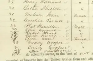 This manifest shows 41 enslaved people who were shipped to New Orleans, Louisiana, from Richmond, Virginia. Among them was Solomon Northup, who was listed as Plat Hamilton on line 33. A free person of color in New York, Northup had been kidnapped and sold into slavery; he was given the name Plat Hamilton aboard the ship. Years later, after he regained his freedom, he told his life story in his autobiography Twelve Years a Slave: Narrative of Solomon Northup, a Citizen of New-York, Kidnapped in Washington City in 1841 and Rescued in 1853, from a Cotton Plantation Near the Red River in Louisiana.