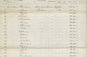 The slaves included William (blacksmith), Lindy (woman laborer), Clary (woman laborer), Jim (boy laborer), Frazier (boy laborer), and the following adult male laborers: Davy, Wash, Lewis, Thornton, Jerry, Henry, Bill, Harry, Isaac, Kellis, Martial, Edmond, Calvin, Jack, Ben, George Mason, Money [?], Monroe, Barber Lewis, B. Jim, George Barber, Dabney, and Jeff.